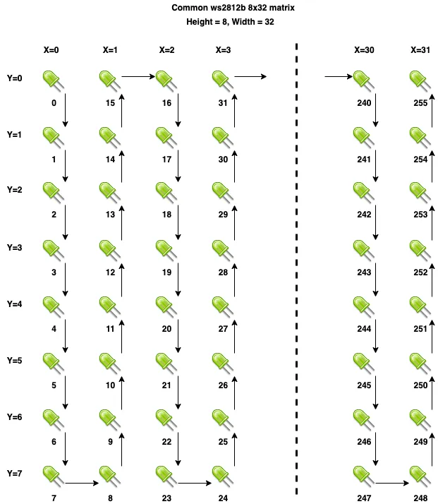 Section titled “BTF-Lighting 8x32 WS2812B Flexible LED Matrix”The following image illustrates the path the addressable strip takes through the common the BTF-Lighting 8x32 matrix.